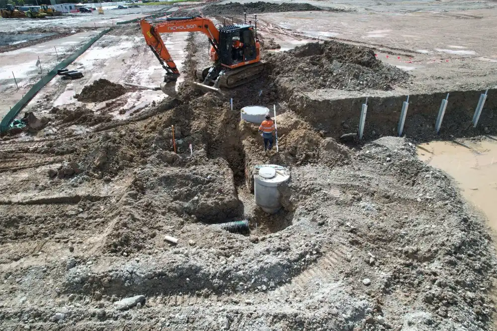 MNCE addressed design complexities such as integration with transport infrastructure and diverse site uses. A stormwater management plan was developed with hydrocarbon containment systems, graded impervious surfaces, and underground containment vessels. Detailed planning for internal roads, vehicle maneuverability, and utility services ensured seamless connection to city infrastructure.